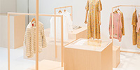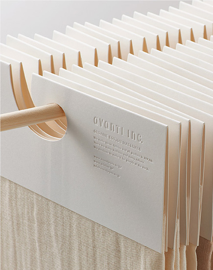 オーガニックコットンブランド「プリスティン」より。生地ハンガーは、素材のふくよかな風合いが引き立つようあえて主張しないデザインに。手芸用の糸玉は、端切れ布の結び方を何度も検証し、ゴミにならず、保管しやすい独自の形状を考案しまし
